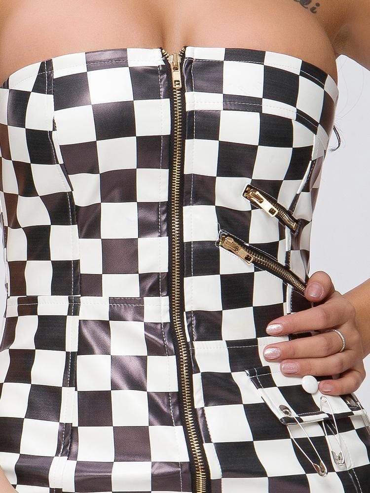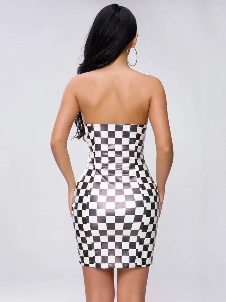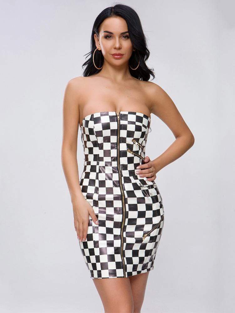 The latest trend party mini Dress,black and white grid print,made of textured leather fabric, wrap-around body, with exaggerated sparkling circle earrings.