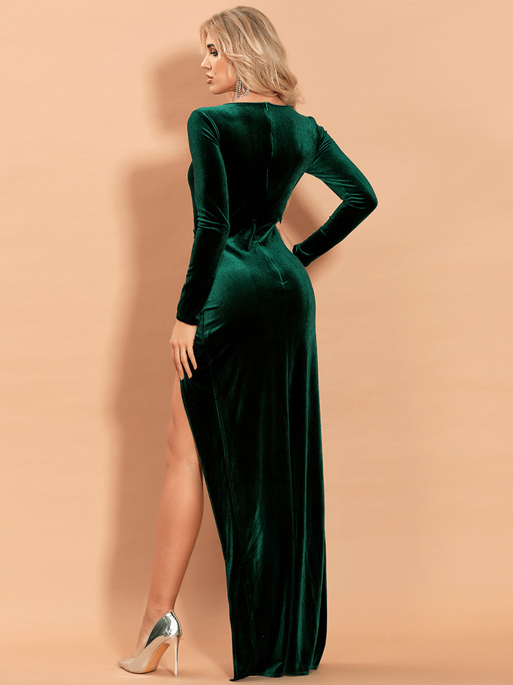 Elegant Dark Green Velvet Long Sleeve High Split Long Dress