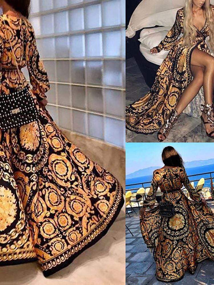 Long Sleeve Print Beach Maxi Party Dress
