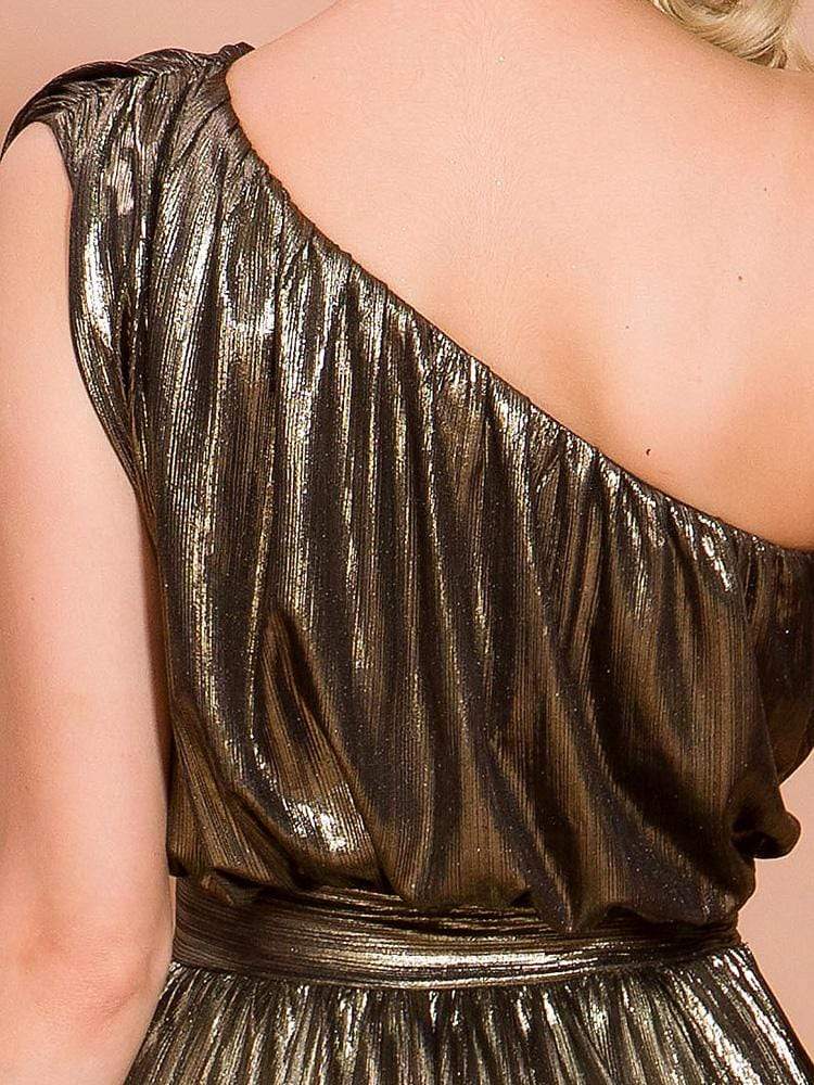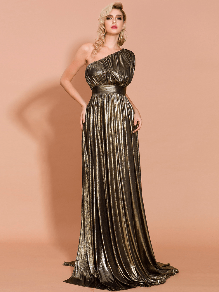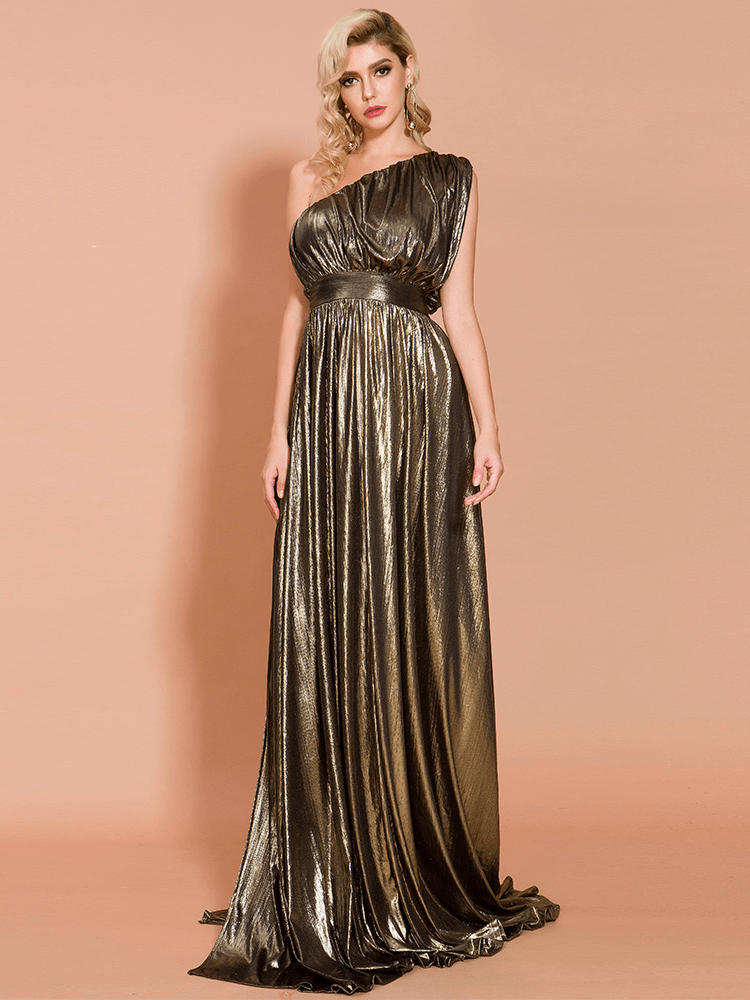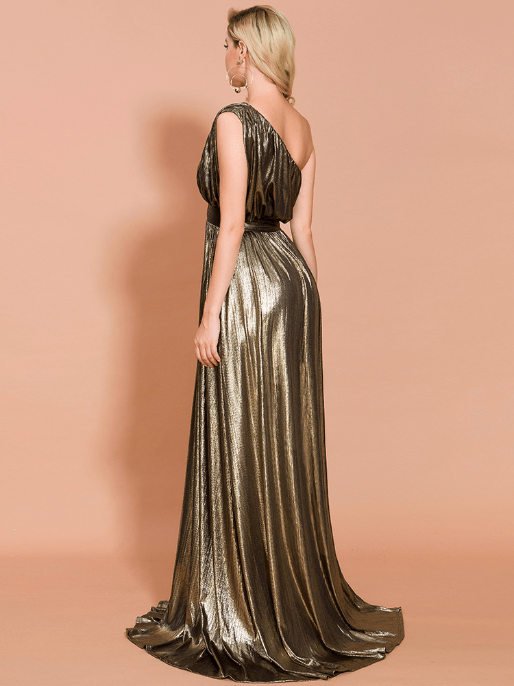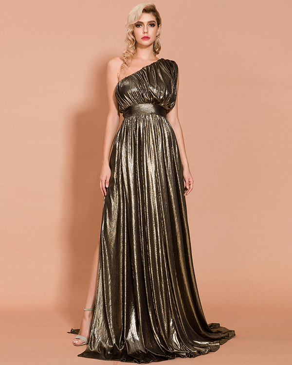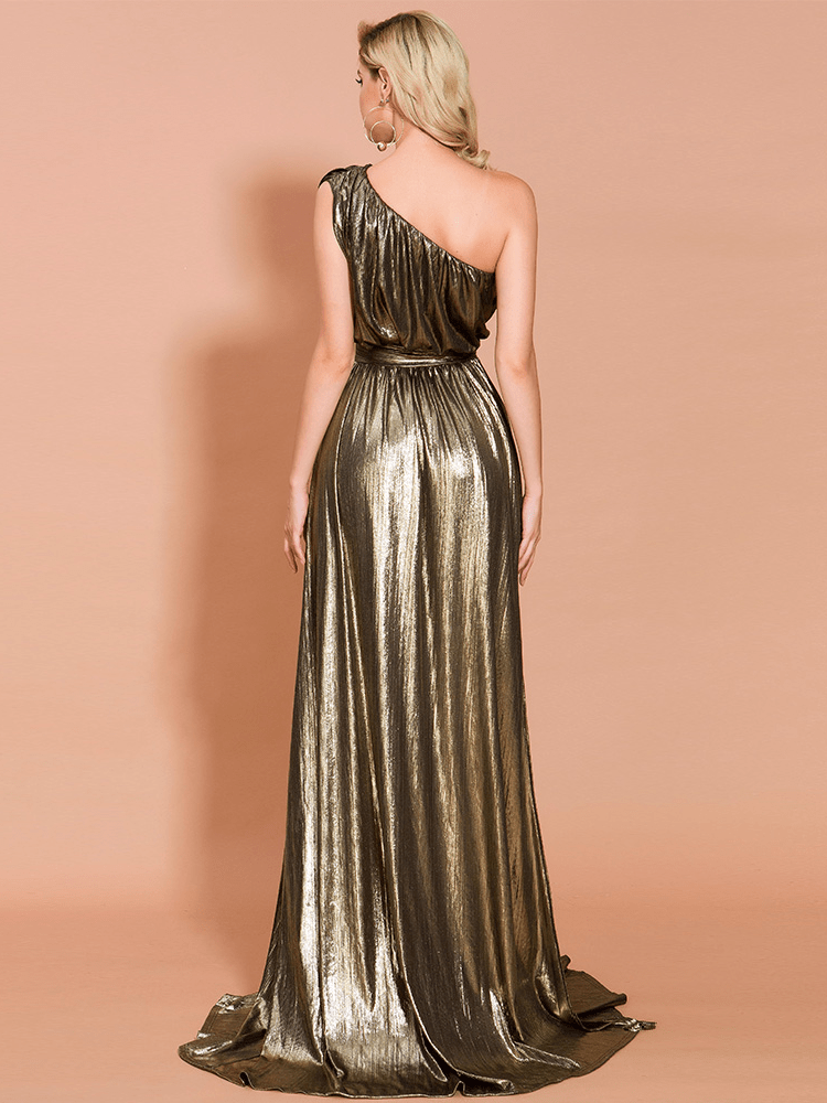 One Shoulder Pleated Shiny High Split Maxi Party Dress