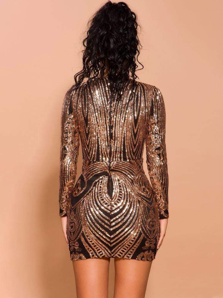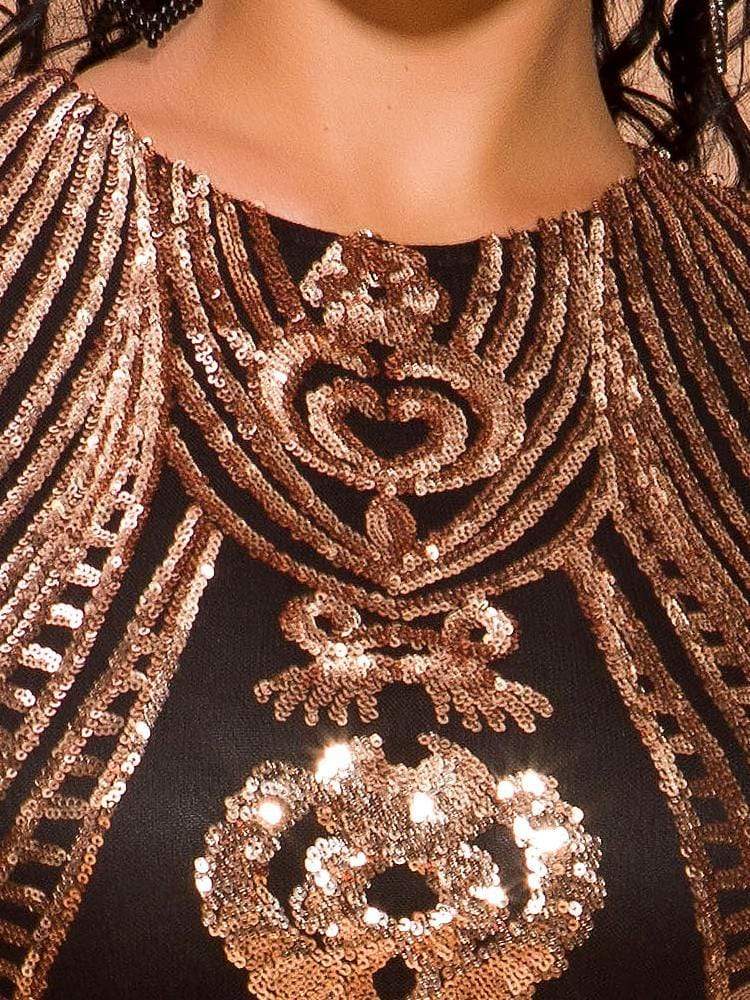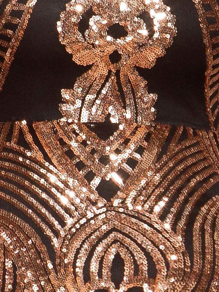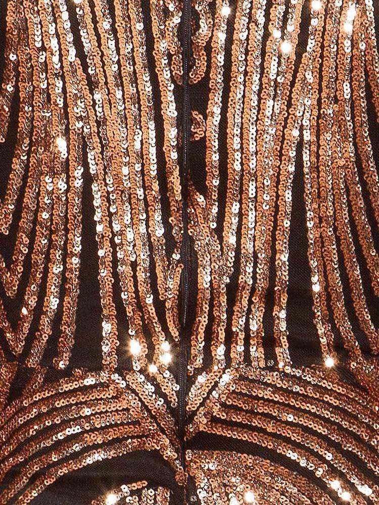 Crafted with golden sequins to create a vintage totem, a stunning metallic texture and with metal geometric earrings.