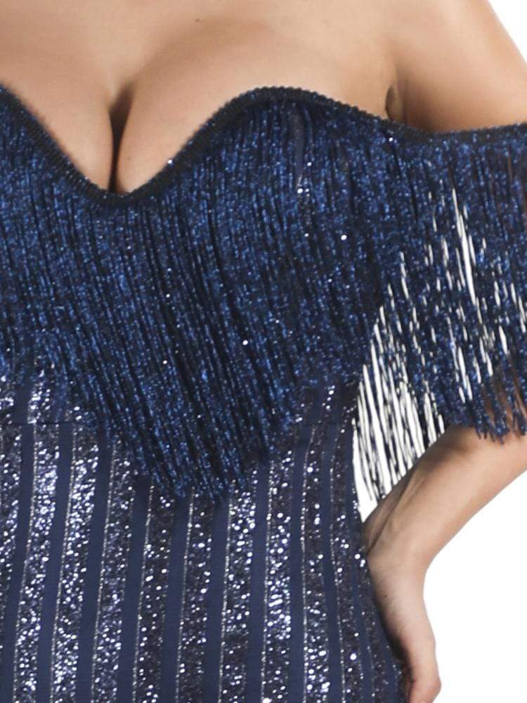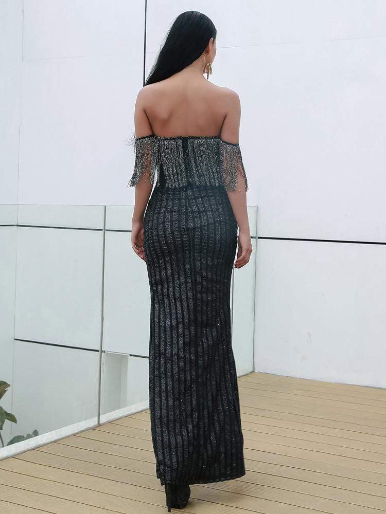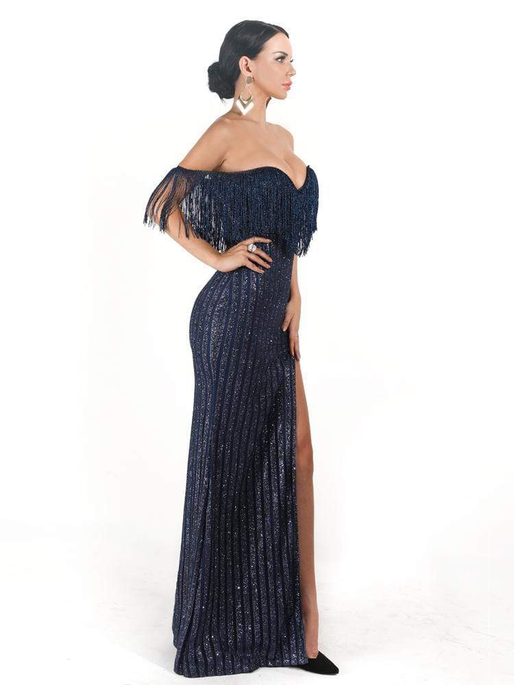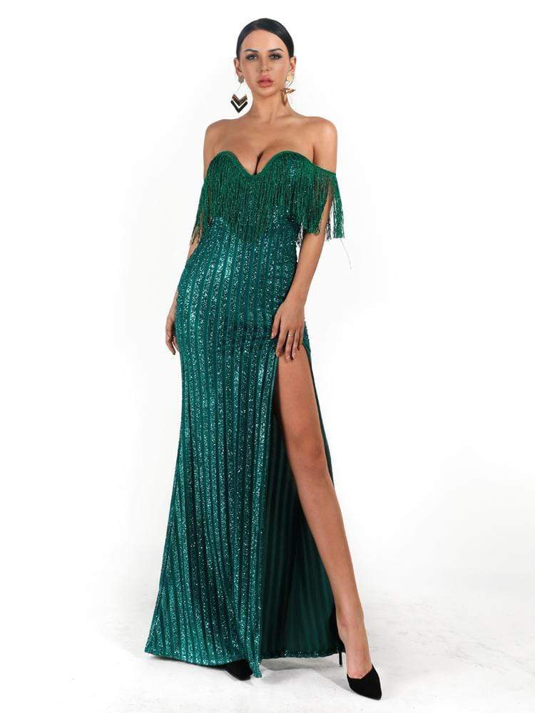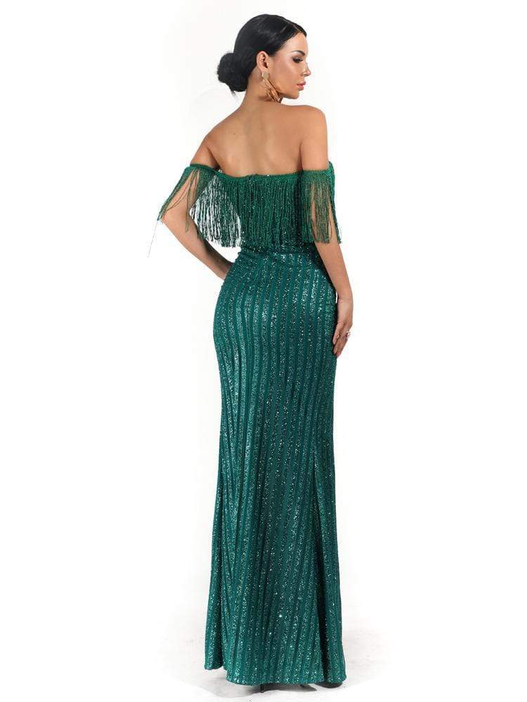 Sexy Elegant V Neck Off Shoulder Tassel Glitter Prom Dress