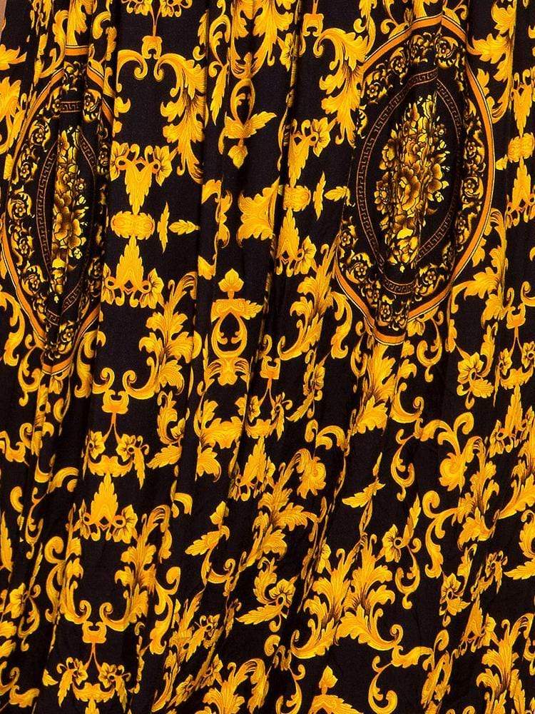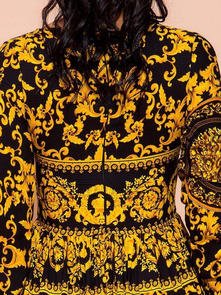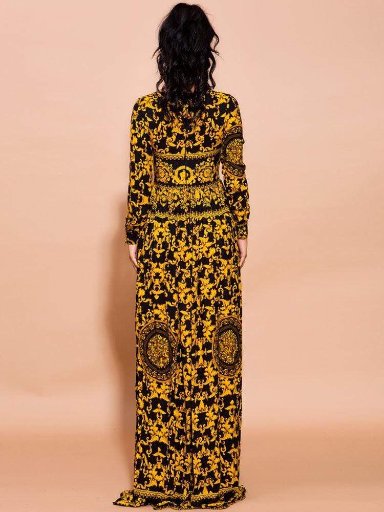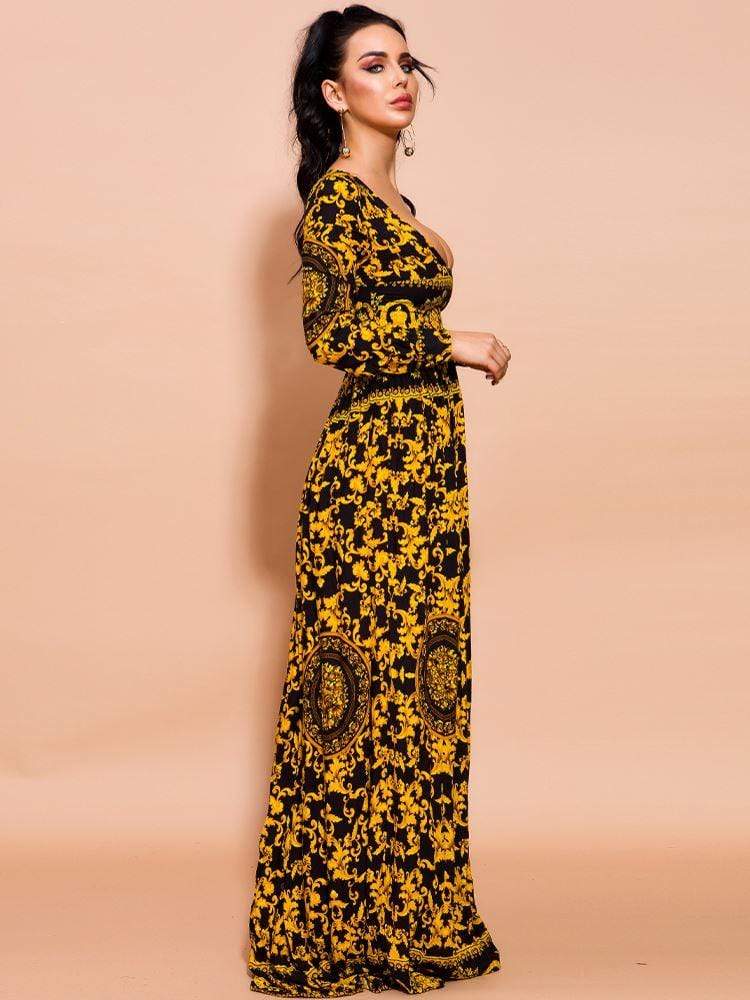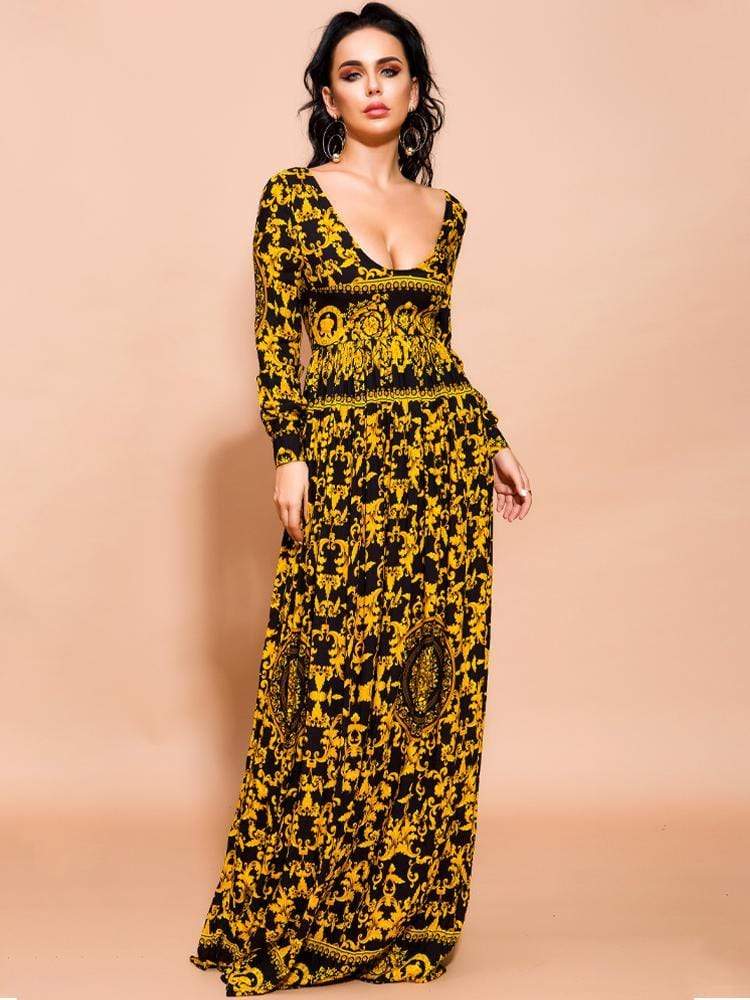 MISSORD brings a new visual impact - 3D embossed artistic sense, gold-colored print on black background, like a walking oil painting, has deep boat neckline and the long sleeves.this unique artistic skirt is suitable for the ball gown.