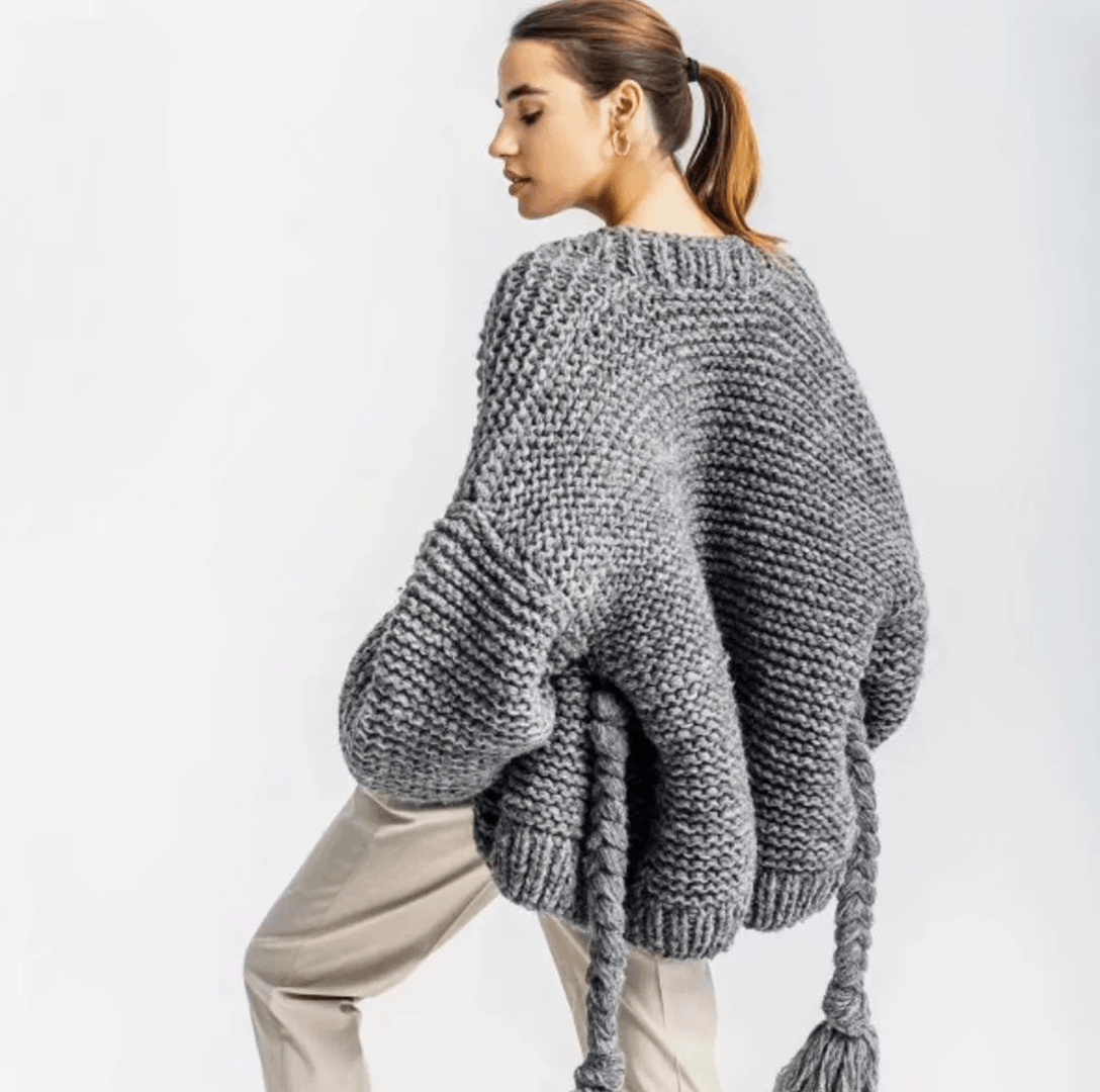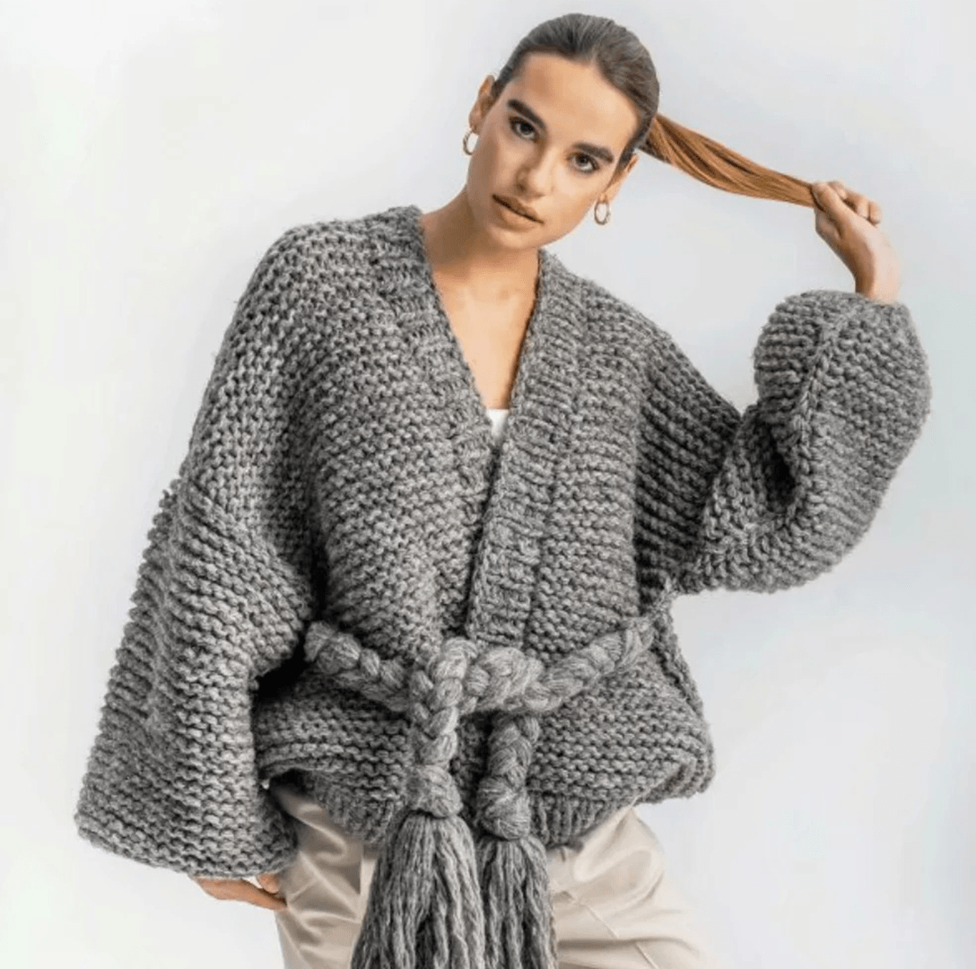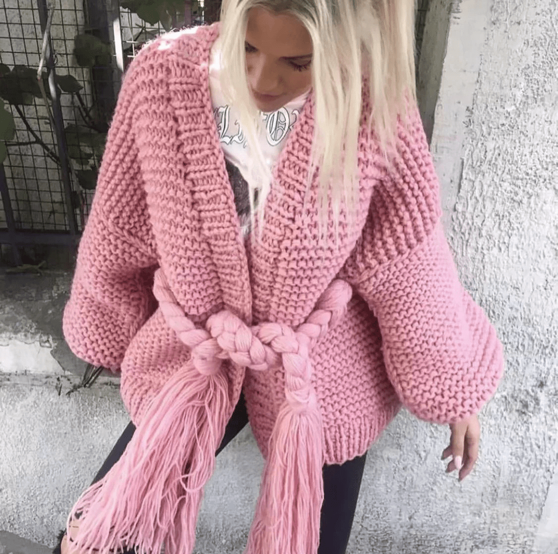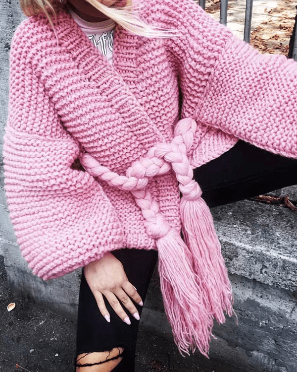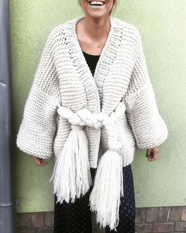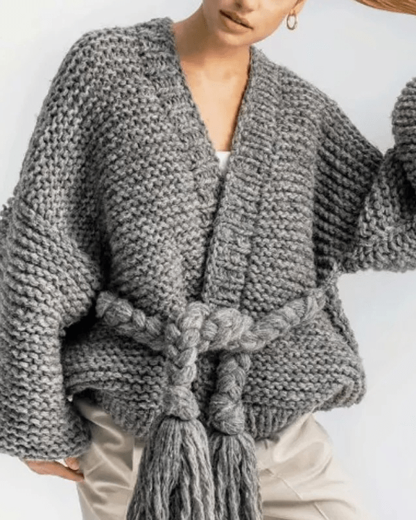 Fringed Lace-Up Lantern Sleeve Sweater Coat