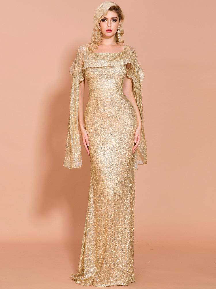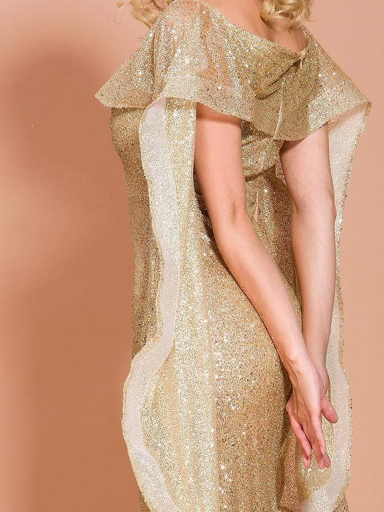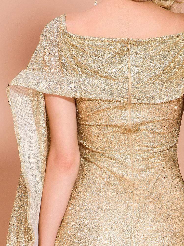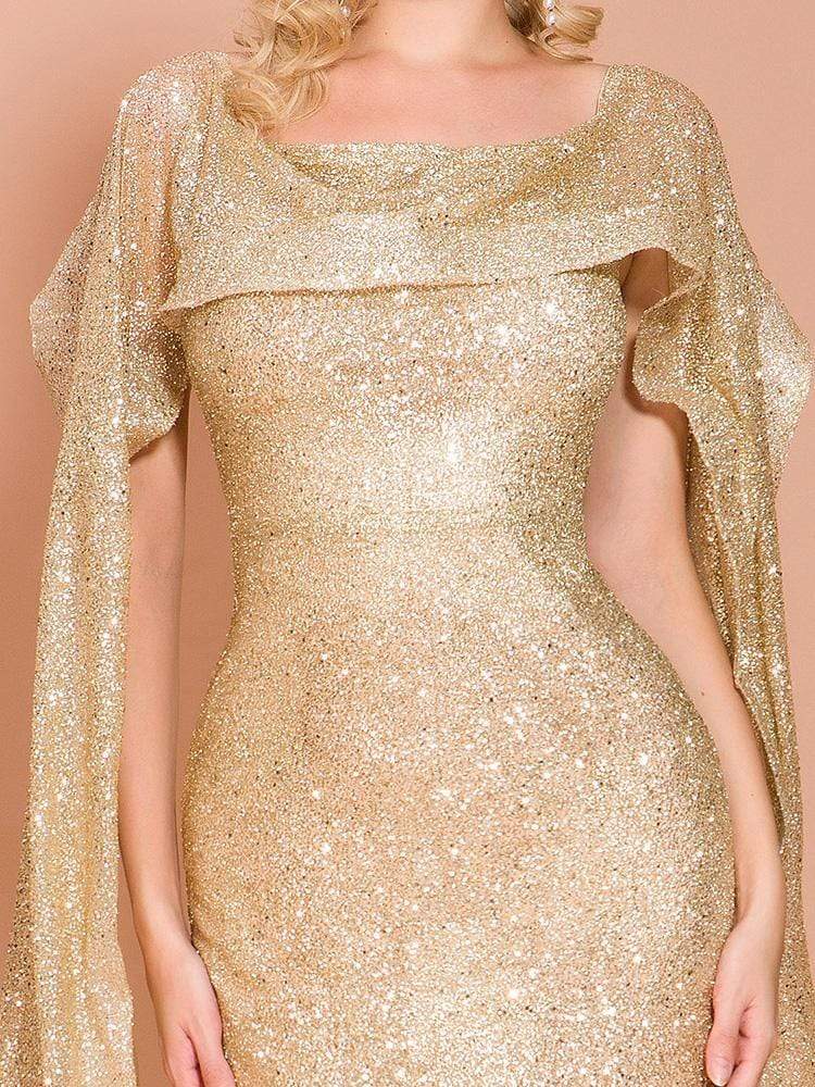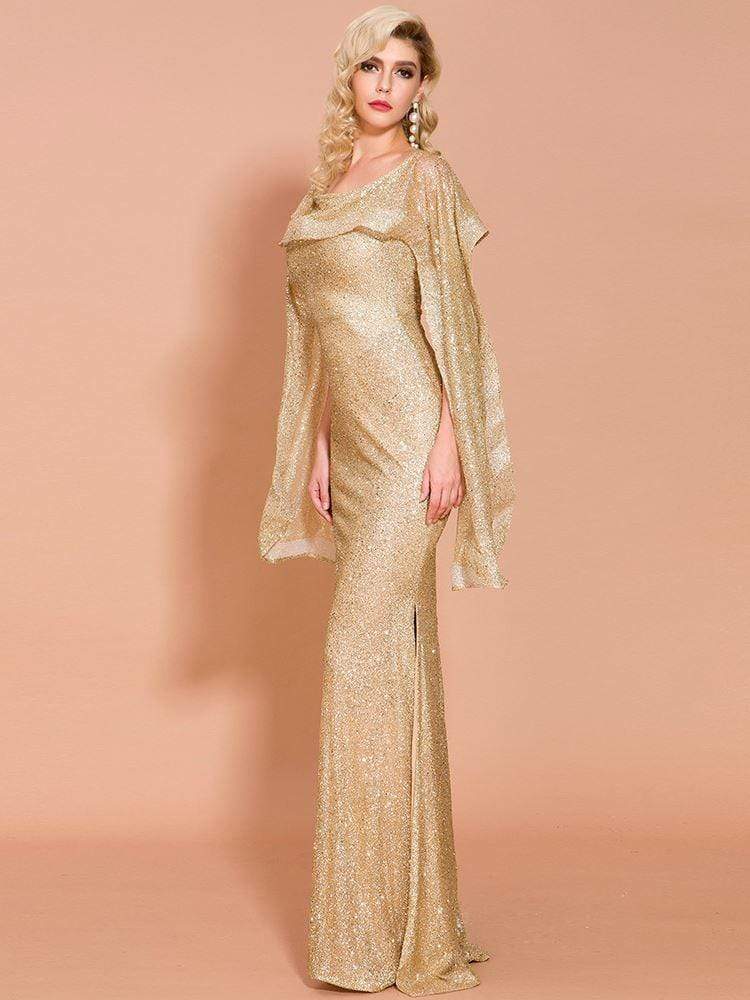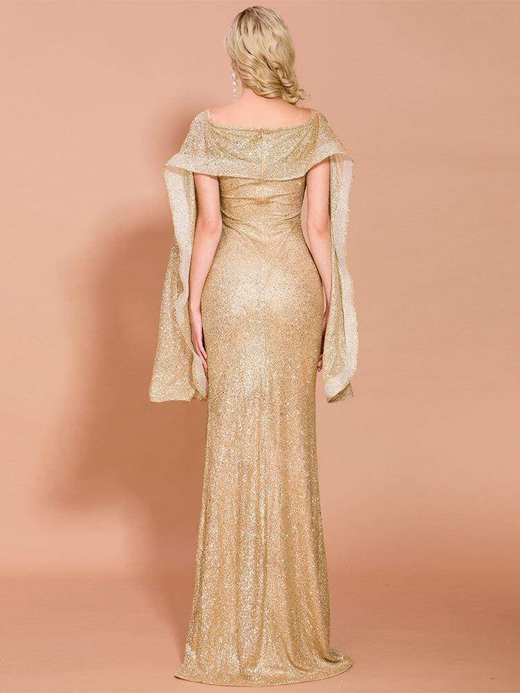 This glittering gown has fluttering shawl sleeves, elegantly folded, gently cut side slits,