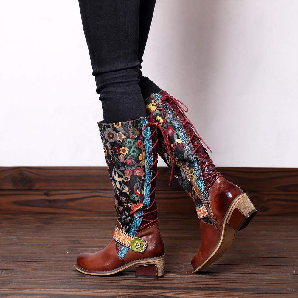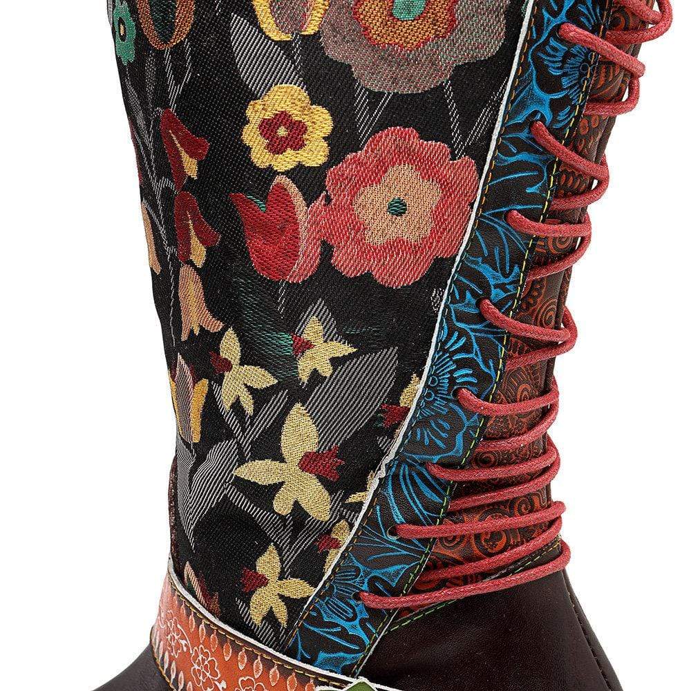 Vintage Ethnic Flowers Pattern Leather Long Boots